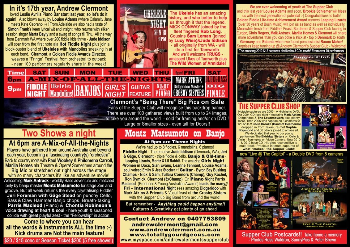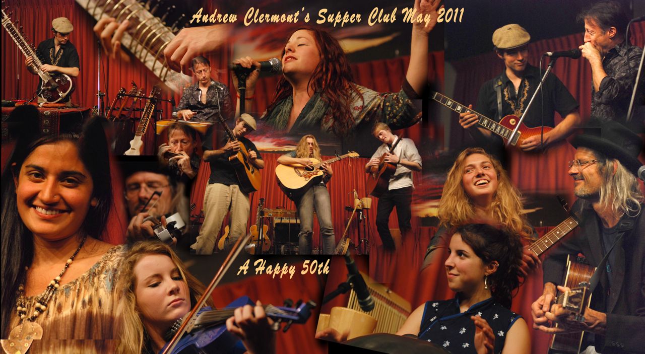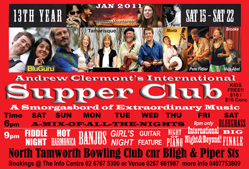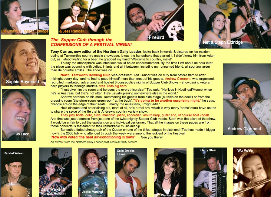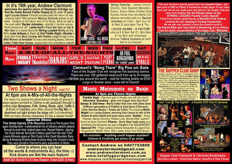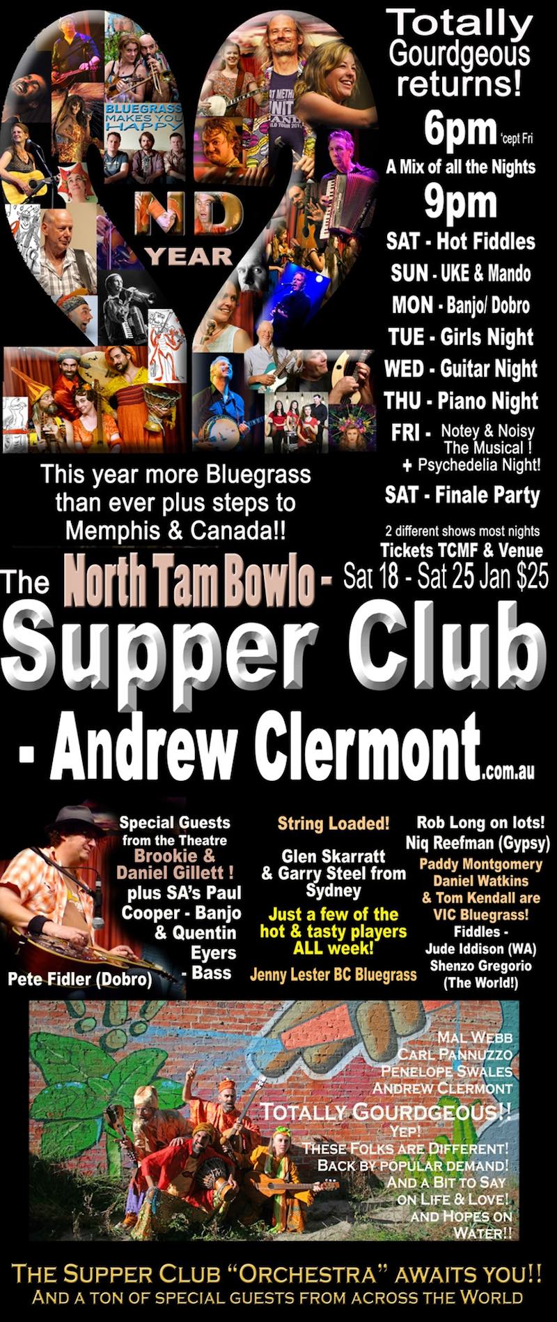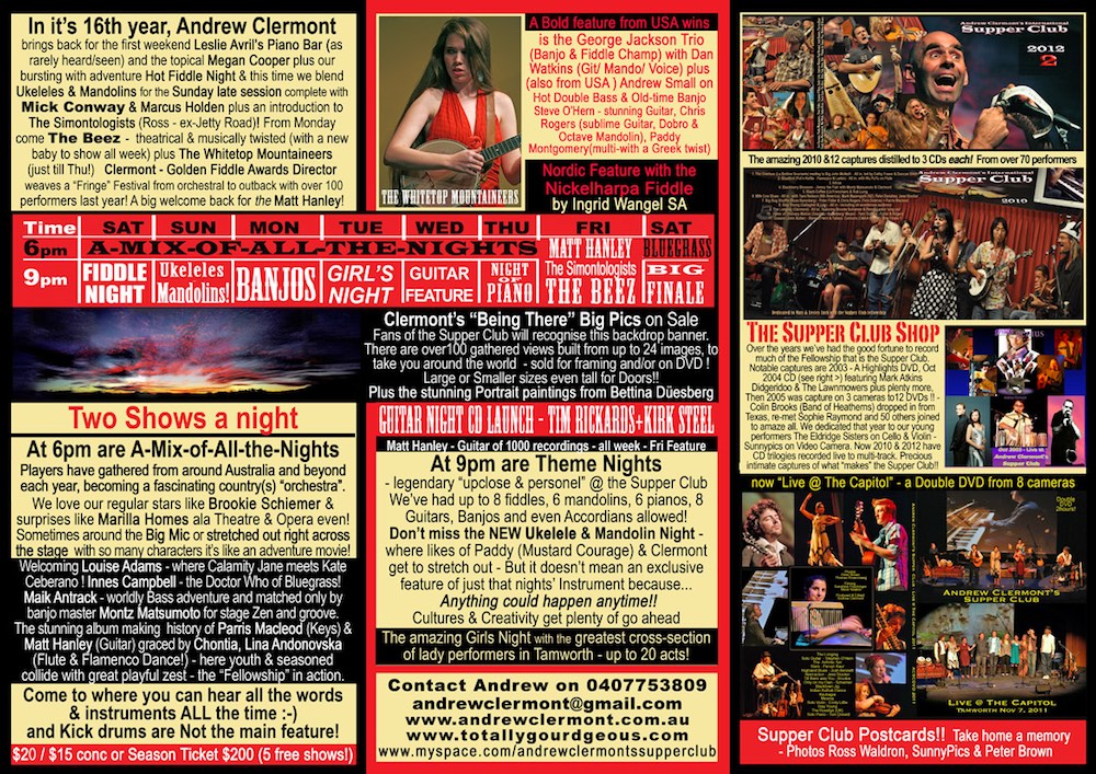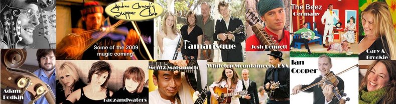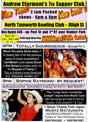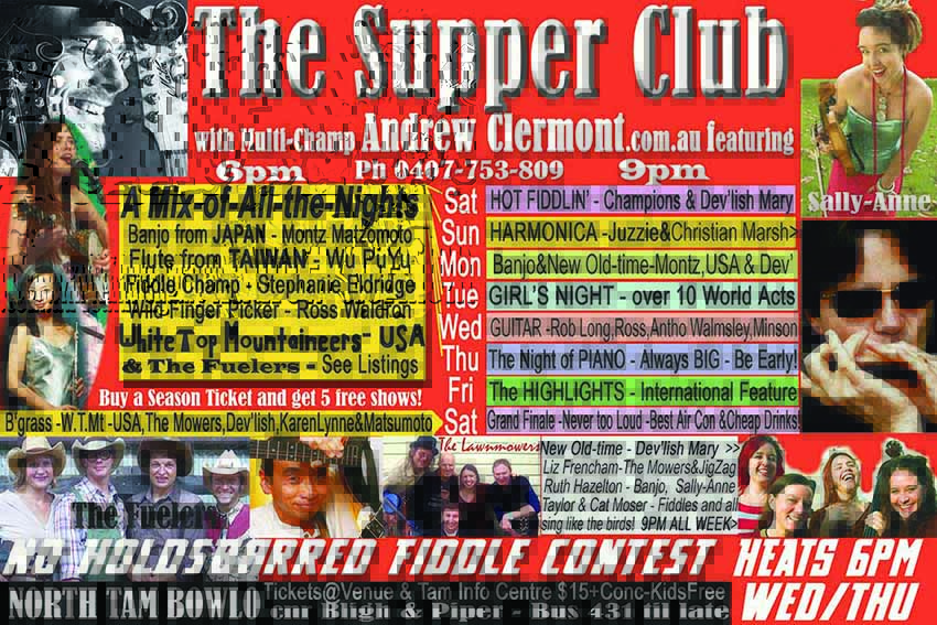 Andrew Clermont who had spent most years of his musically adventurous life gathering surprising (and surprised!) musicians & artists where-ever he appeared. The pinnacle of this is The Supper Club. He's been a Bluegrass Guitar Champion 3 times (see the Re-release of his solo masterpiece 'Homegrown Vol.2' on CD) and seen mostly on Fiddle & Mandolin with Tom T Hall to John Chester, Brian Young to Xavier Rudd & The Waifs. He is a true Chameleon still performing in 5 Bands - Dya Singh (a decade lapping the world Indian Sikh Style!); The Lawnmowers (the cutting 'hedge' of Bluegrass!); Celtic Conundrums (Glen Innes Celtic Fest 2005) and here - The Supper Club; regulars to Vienna(Austria) - Totally Gourdgeous & Fiddlers Feast (their 11th Tamworth)