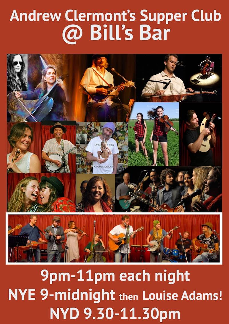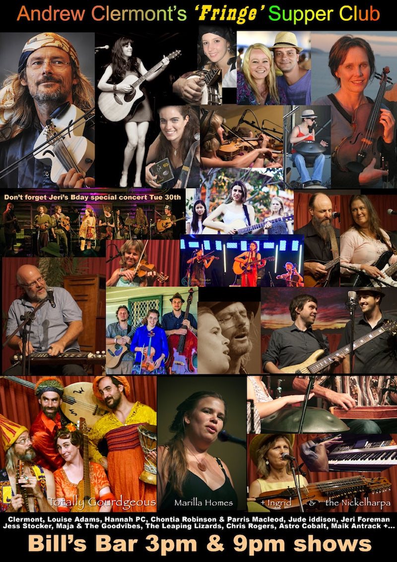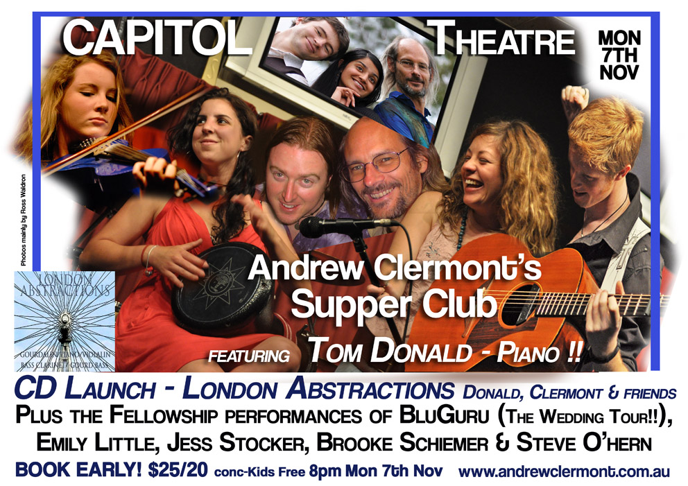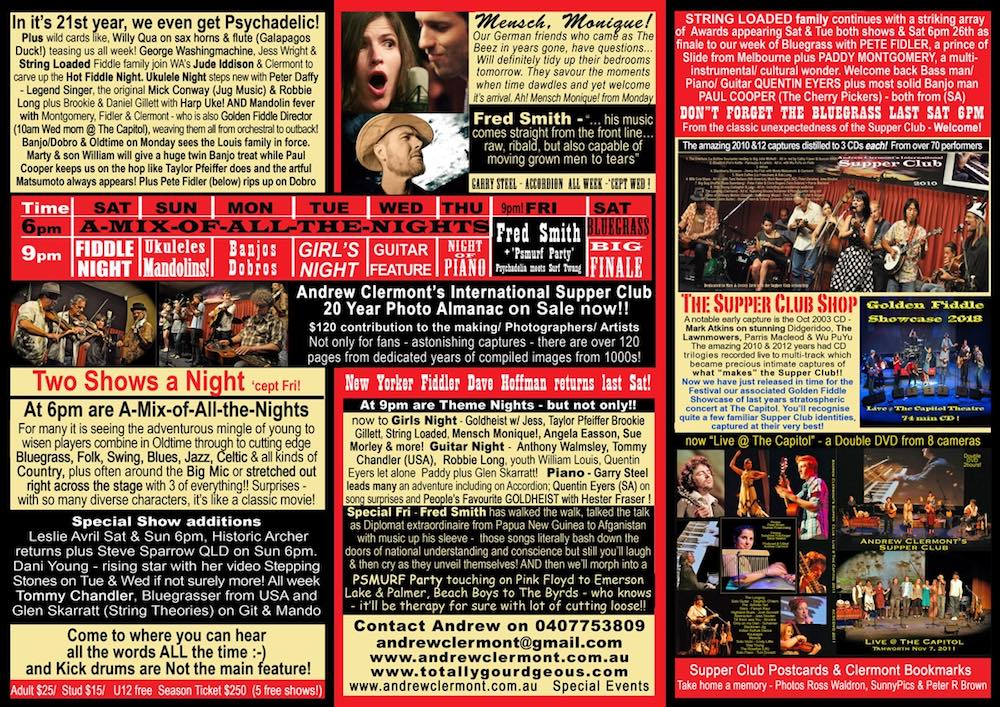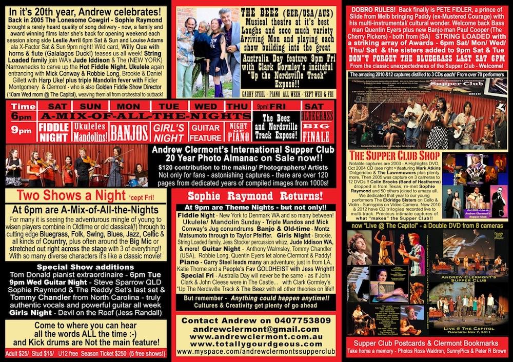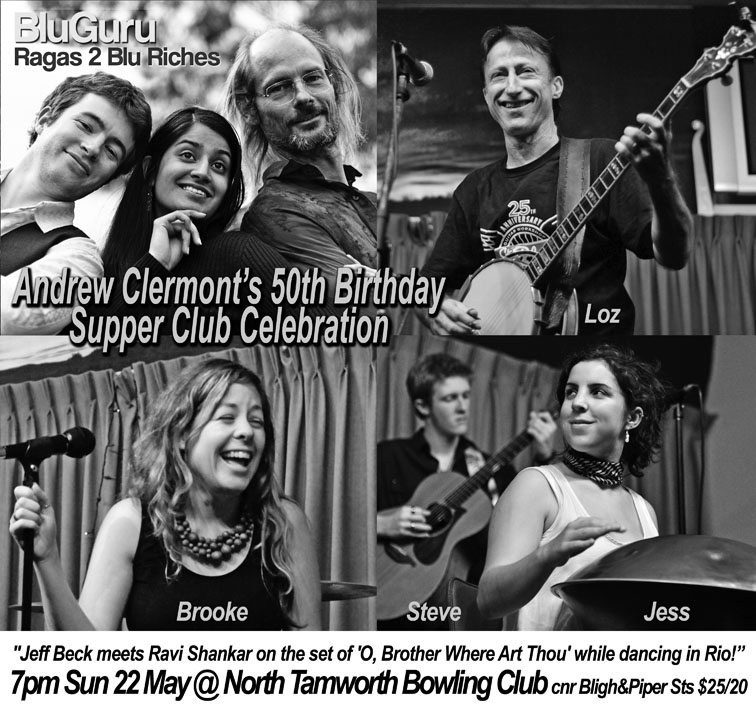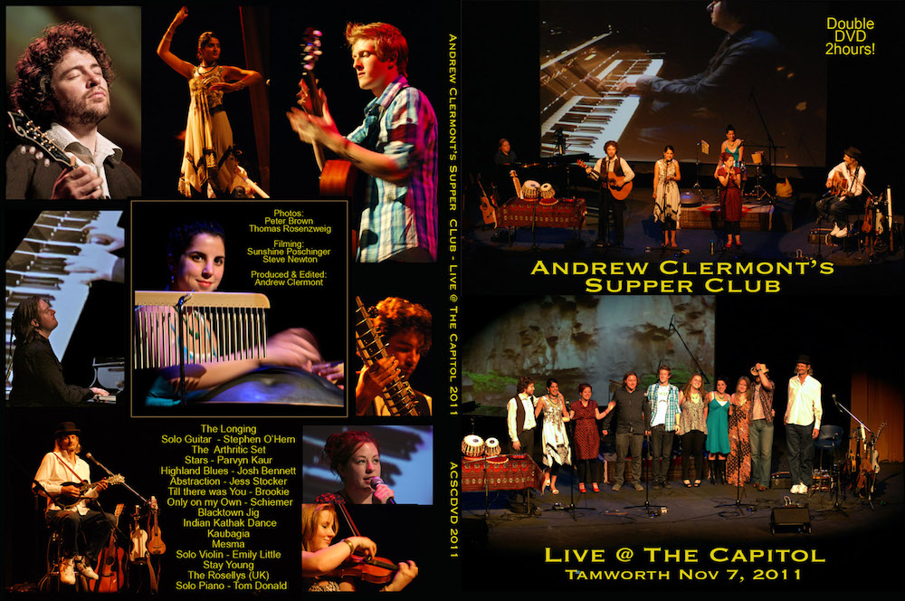 Andrew Clermont who had spent most years of his musically adventurous life gathering surprising (and surprised!) musicians & artists where-ever he appeared. The pinnacle of this is The Supper Club. He's been a Bluegrass Guitar Champion 3 times (see the Re-release of his solo masterpiece 'Homegrown Vol.2' on CD) and seen mostly on Fiddle & Mandolin with Tom T Hall to John Chester, Brian Young to Xavier Rudd & The Waifs. He is a true Chameleon still performing in 5 Bands - Dya Singh (a decade lapping the world Indian Sikh Style!); The Lawnmowers (the cutting 'hedge' of Bluegrass!); Celtic Conundrums (Glen Innes Celtic Fest 2005) and here - The Supper Club; regulars to Vienna(Austria) - Totally Gourdgeous & Fiddlers Feast (their 11th Tamworth)