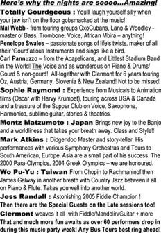 www.PenelopeSwales.com (the Luthier - converting vine to violin! And guitar/ bass/ percussion etc), Carl Pannuzzo and Mal Webb (with Lano & Woodley) with their respective dot com websites have their audiences laughing hard when not amazed at the antics of their performance . Together with Andrew, you'll never see Clermont the same after this!!